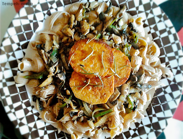 Cortamos el tempeh a rodajas, salpimentamos y doramos en una paella con el romero y un poco de aceite de oliva, hasta que quede bien dorado por fuera.