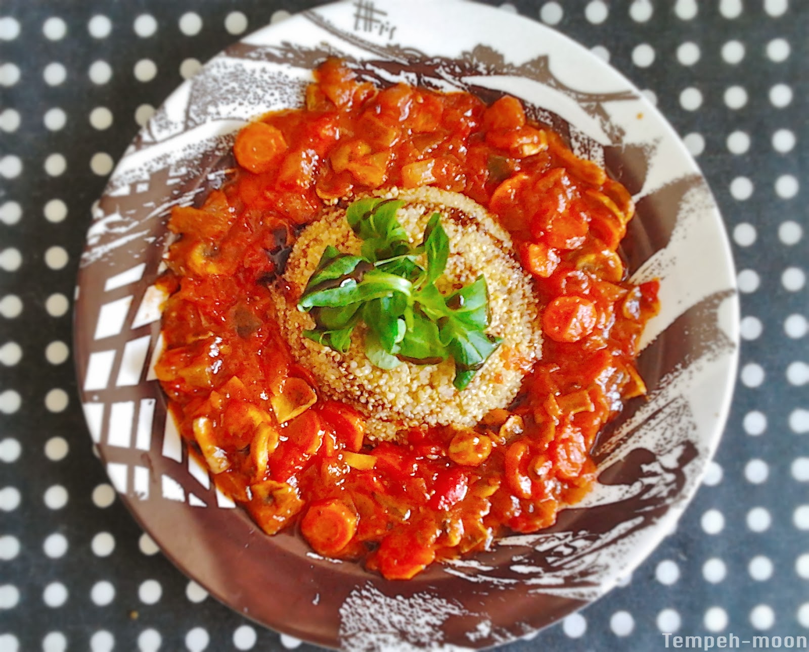 En una paella con un poco de aceite de oliva, salteamos la cebolla a trocitos, el pimiento rojo, las zanahorias, los calabacines y por ultimo los champiñones, añadimos la salsa de tomate, con sal, pimienta y una pizca de azúcar y tapamos durante unos 10 minutos.