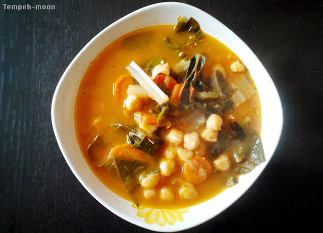 Salteamos las zanahorias en la olla, y llevamos a ebullición con el caldo. Añadimos las acelgas troceadas, los garbanzos, el sofrito, la sal, los condimentos al gusto, y dejamos hervir durante unos 20 minutos.