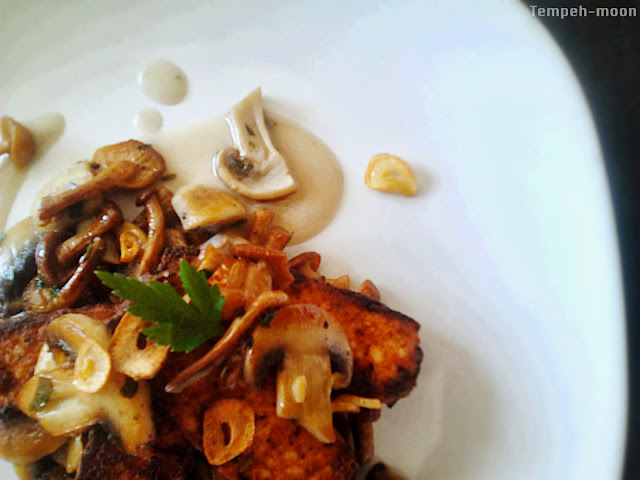 - Se puede emplatar poniendo unas cucharadas de crema debajo, luego las setas, y disponer las tiras de tofu por encima. Unas cuantas setas mas y listo!!