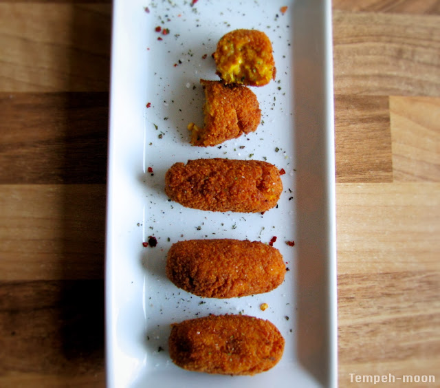 Con una cucharita cogemos un poco de masa y hacemos bolitas, pasamos por el pan rallado y freímos en abundante aceite. Luego disponemos las croquetas encima de un papel secante y listo!!