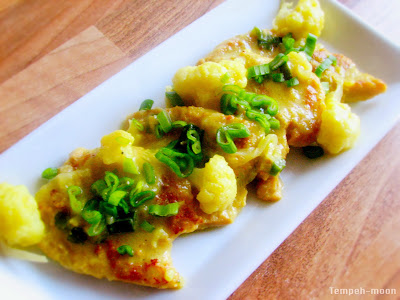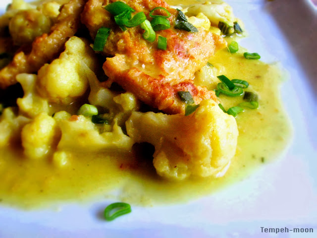 Salteamos la cebolla picada y la coliflor hasta que queden dorados, luego añadimos el jengibre,un poco de sal, pimienta, curry y finalmente los filetes de soja.