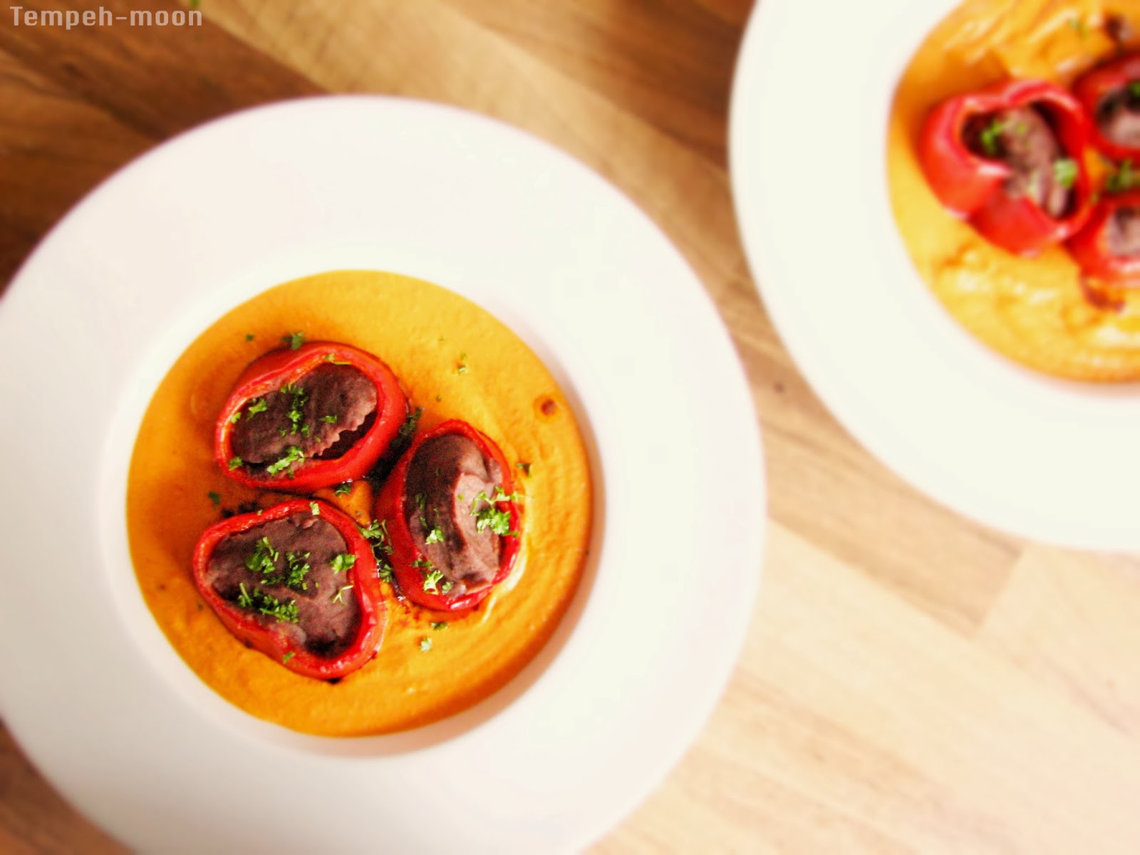 Cuando los pimientos estén ya un poco dorados, los sacaremos del horno, y rellenaremos con el paté.