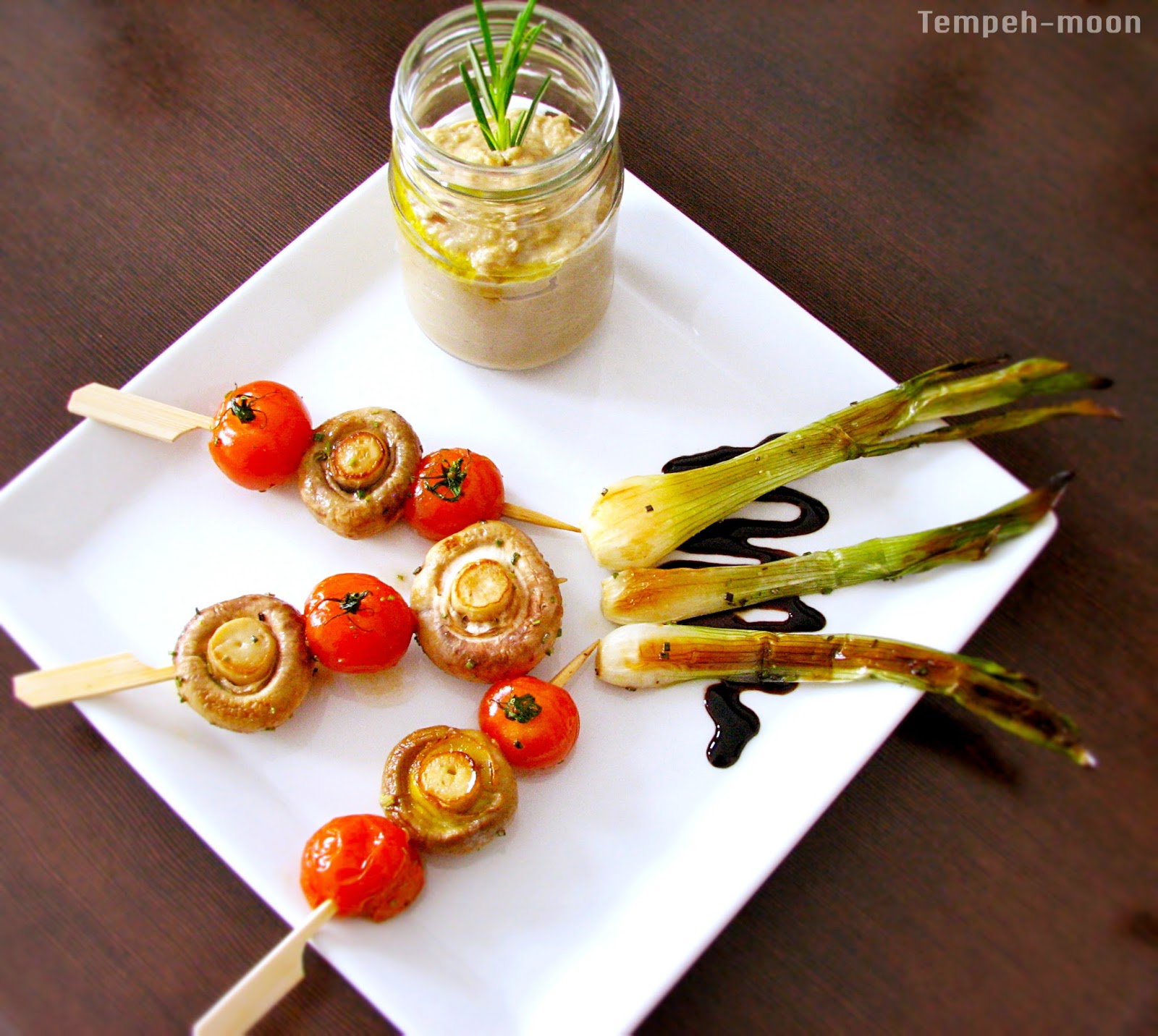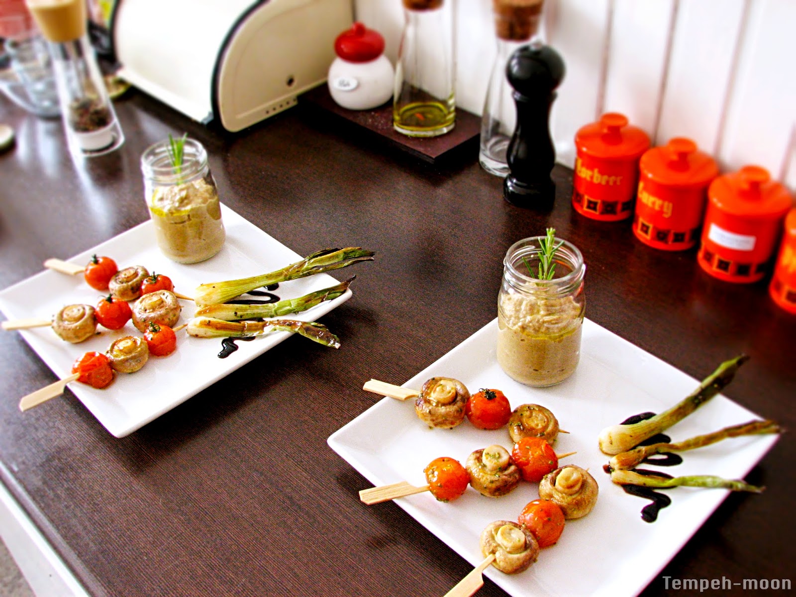 - Este plato tiene una presentación mas elaborada, pero en realidad es todo muy sencillo! solo hay que pinchar los champis y tomates, y disponer las cebollas largas encima de un poco de crema de balsámico.
