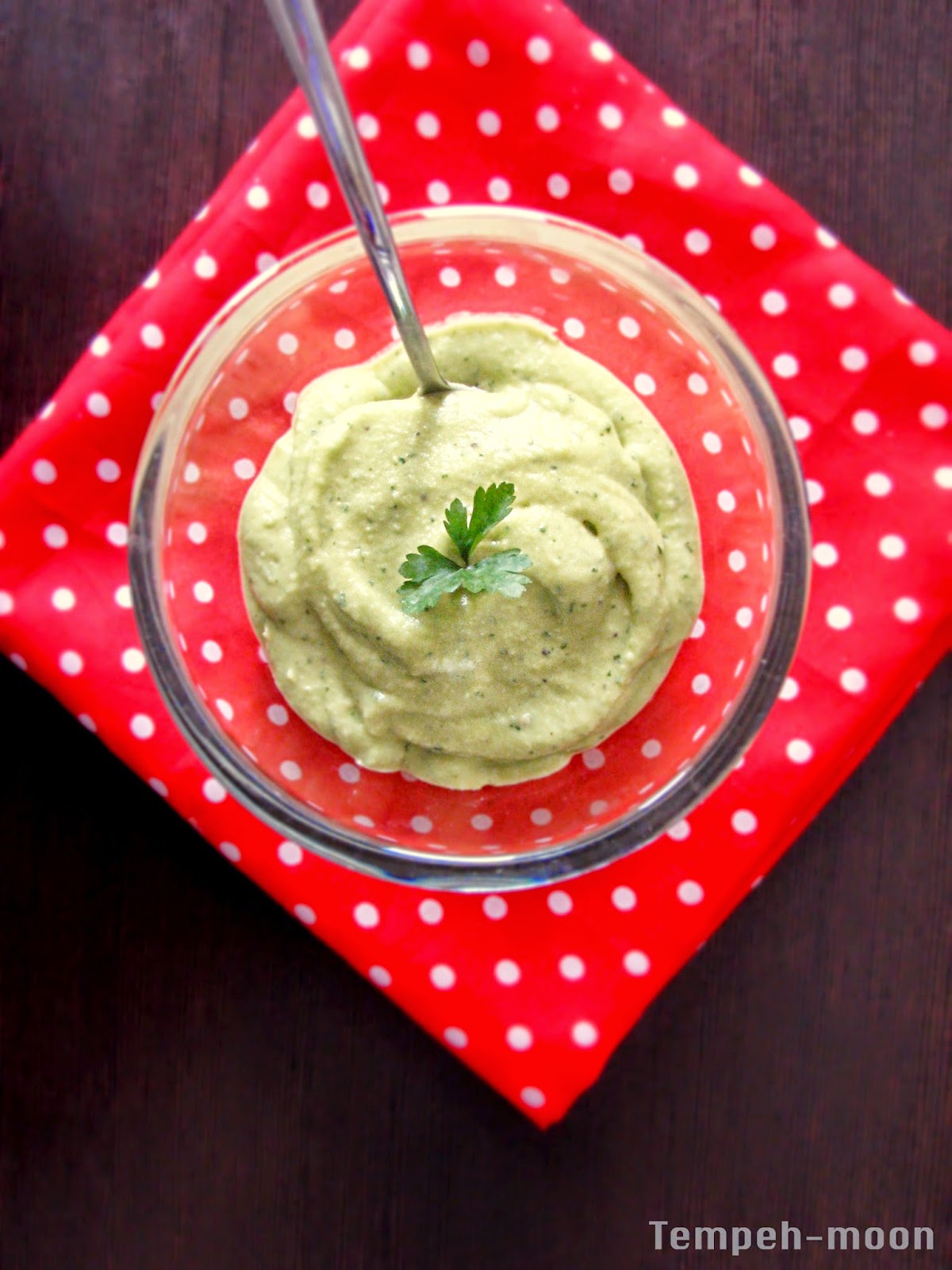 Cortar el aguacate a trozos, y triturar junto con el ajo, el zumo de un limón, un puñado de perejil fresco, sal, pimienta, y aceite de oliva. Añadir el aceite de oliva por último muy despacio, así conseguiremos mas cremosidad. Si vemos que nos queda muy espeso, podemos añadirle un poco de agua, hasta que consigamos la consistencia adecuada.