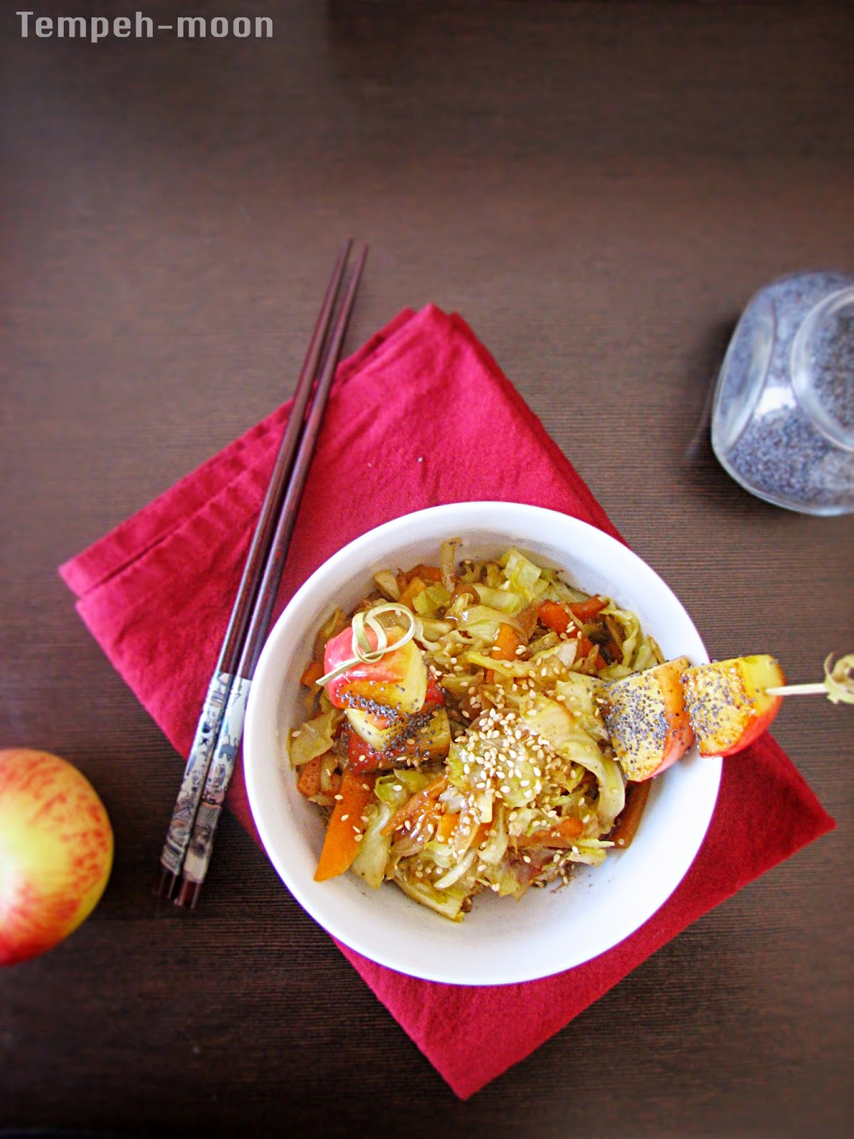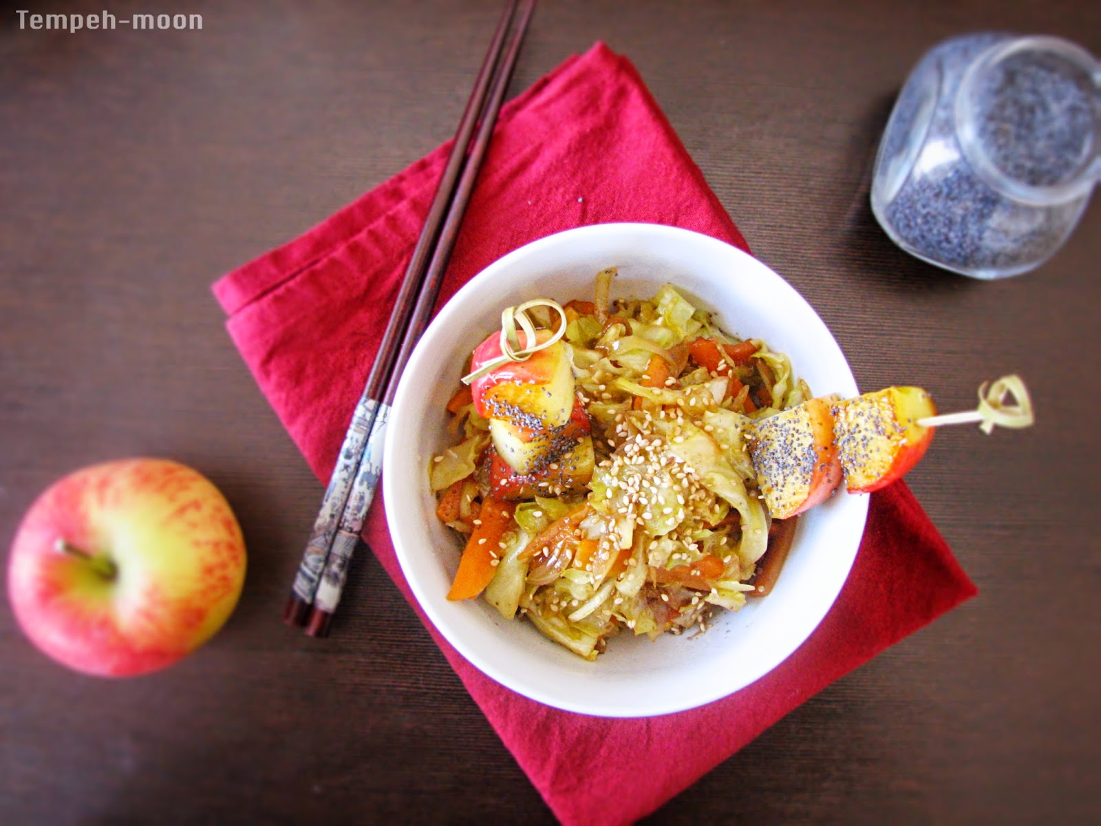 Para emplatar solo hay que colocar unas cucharadas del salteado, y espolvorear un poco de sésamo por encima. Los dos pinchos de manzana le darán un toque divertido y dulzón al plato.