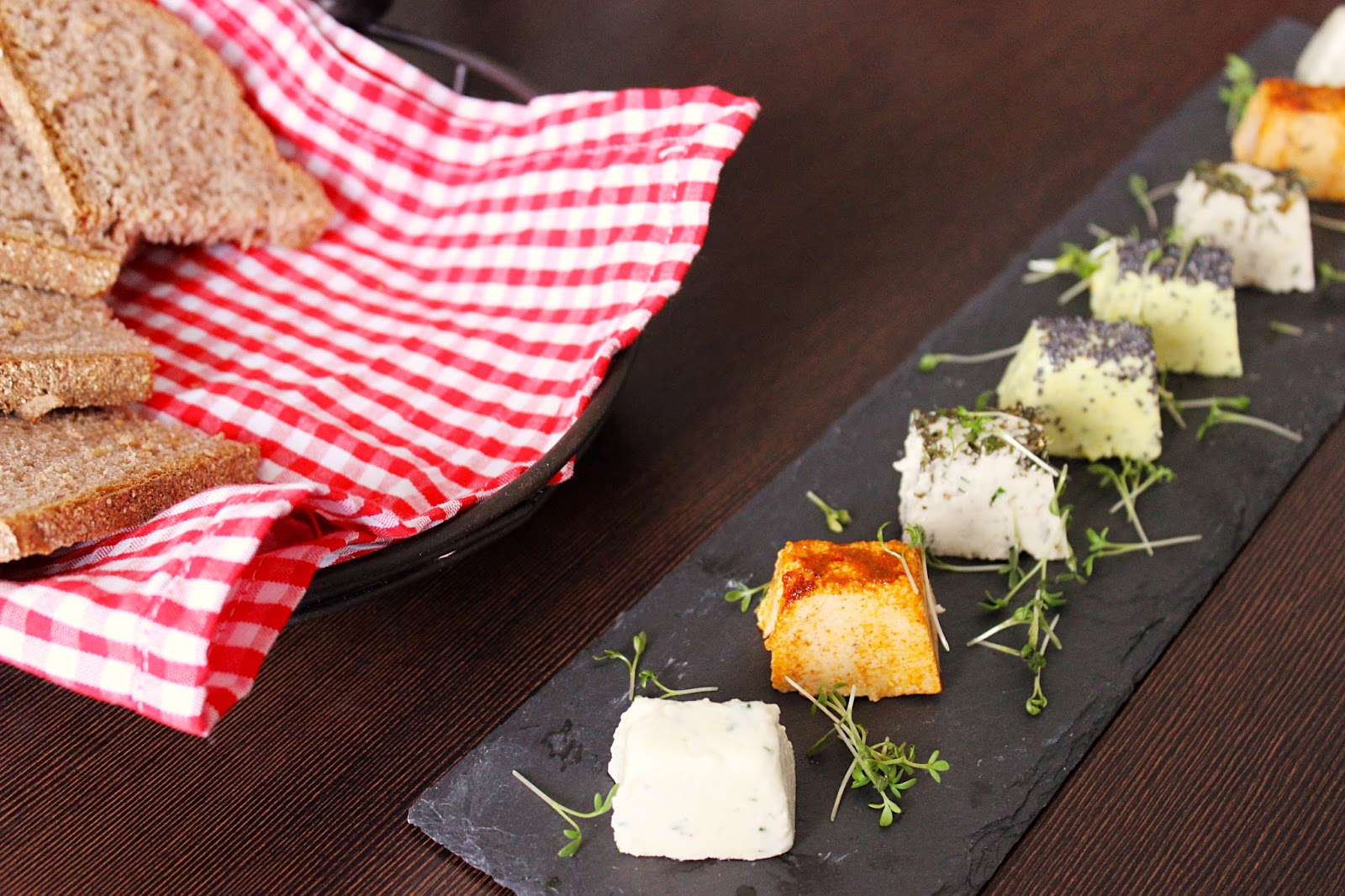 Wasser im Topf aufkochen und Agar-Agar für einige Minuten hinzufügen. In einer Schüssel Cashewnüsse, Mandeln, Hefeflocken, Salz, Olivenöl, den Saft einer halben Limette und das Wasser mit Agar-Agar gut zusammen vermischen. Dann die Mischung auf 4 kleine Schüsseln verteilen und darin die verschiedenen Geschmacksrichtungen vorbereiten, z.B. 1 TL Kurkuma und Mohn für die Kurkuma-Käsewürfel. Dasselbe mit den anderen Geschmäckern.