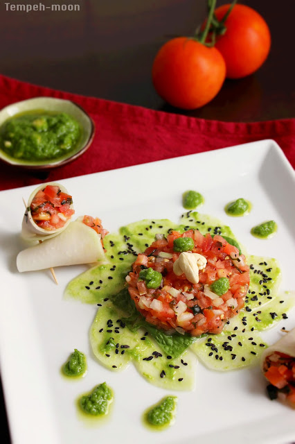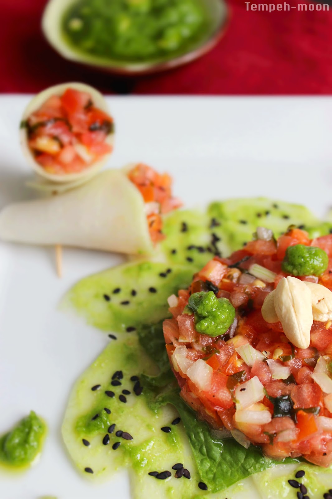 Mientrastanto cortamos los tomates, cebolla, algas, y mezclamos con sal, pimienta y un poco de aceite de oliva.