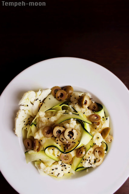 Decorar con unas aceitunas y coliflor laminadas, y sésamo negro.