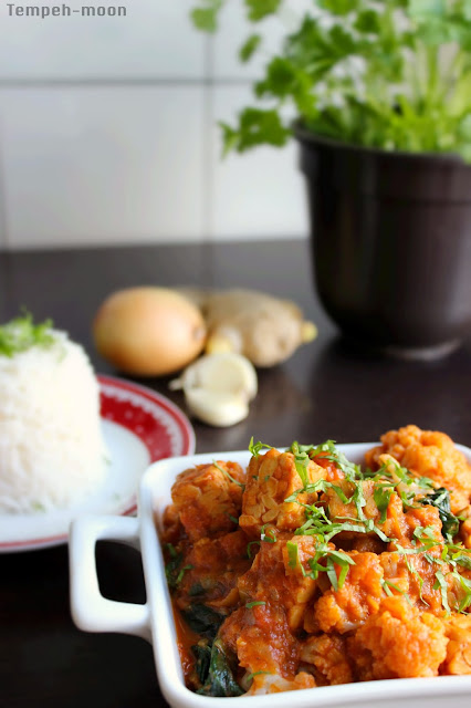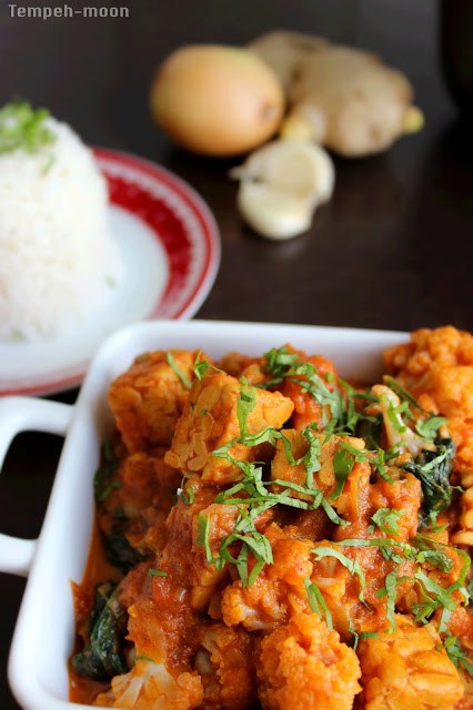 Cortamos el tempeh y la coliflor a dados y los maceramos con una mezcla de leche de coco, aceite de oliva y unas cucharaditas de Garam masala.