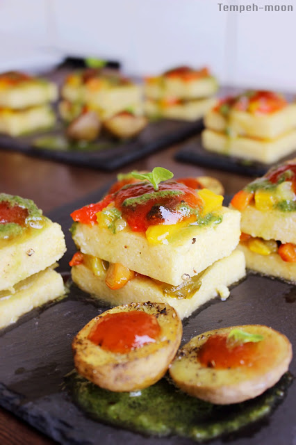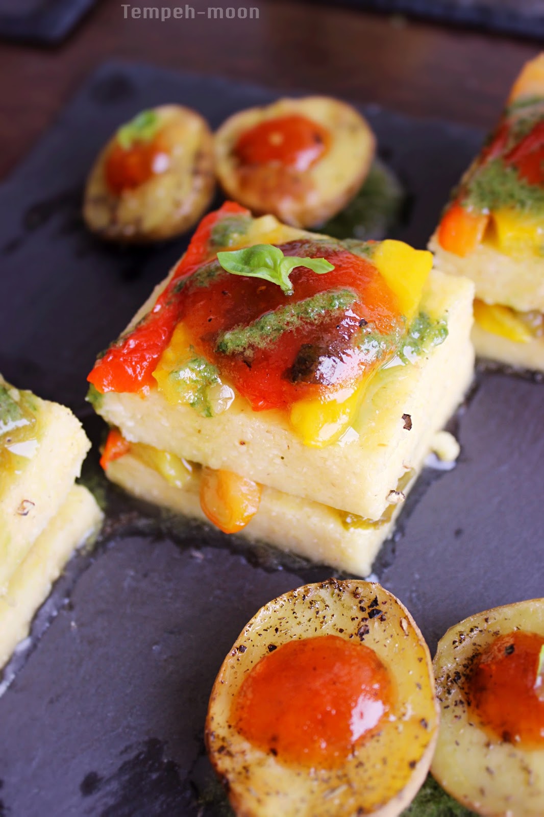 Al emplatar cortamos la polenta a cuadraditos, colocamos unas tiras de pimiento, y repetimos la acción. Luego ponemos una cucharadita de mermelada por encima, y opcional un poco de pesto de albahaca. (solo hay que triturar los ingredientes y sazonar al gusto)