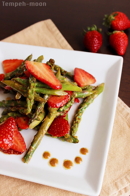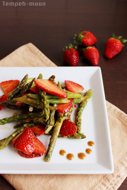 Preparamos la vinagreta juntando los demás ingredientes y mezclamos con los espárragos y las fresas antes de emplatar.