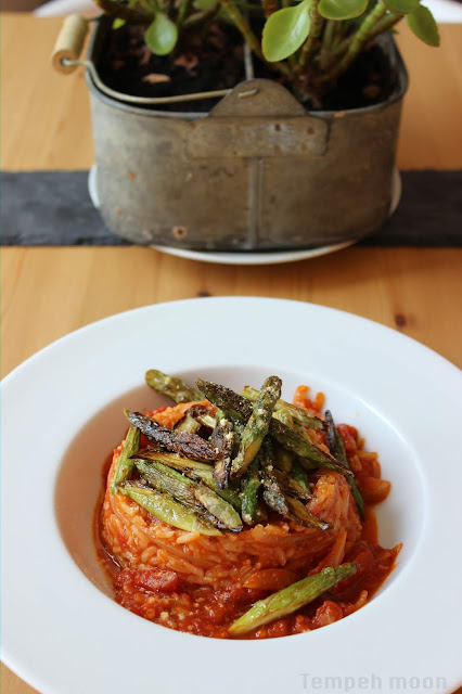 Mezclamos el arroz con la salsa de tomate reservando un par de cucharadas que colocaremos a los lados. Emplatamos con la ayuda de una anilla, colocamos los espárragos encima, y sazonamos con Parmesano vegano....et voilà!