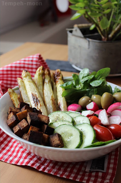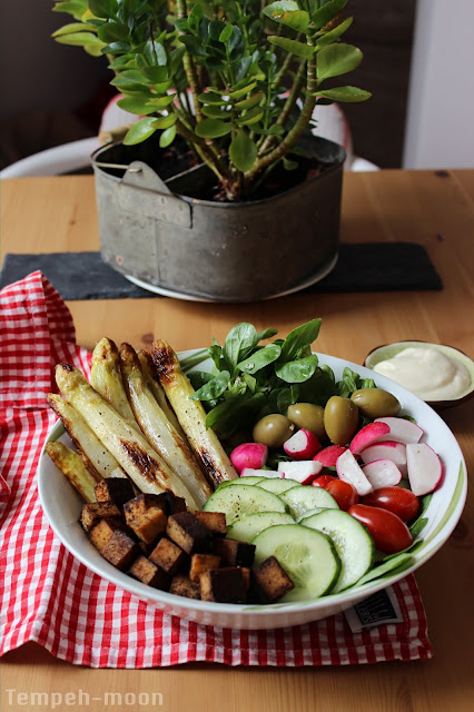 El resto de vegetales se pueden cortar y colocar al gusto, añadirle una salsa o vinagreta, yo opté por una crema de yoghurt de soja con un poco de limón, sal, pimienta, pero con cualquier vinagreta clásica quedará genial! :)