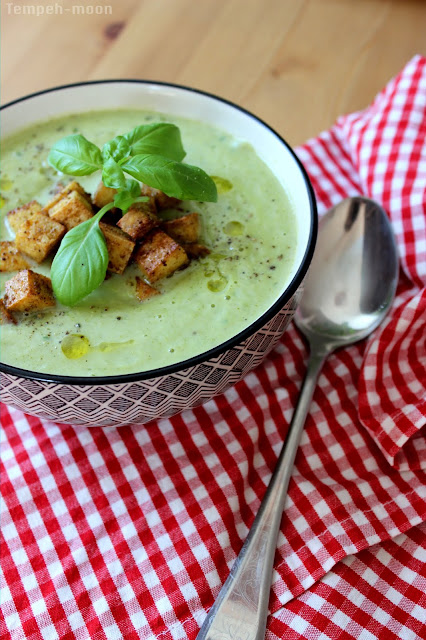 Trituramos bien fino y añadimos el zumo de una lima, la albahaca, la crema de leche de soja, y corregimos de sal y pimienta.