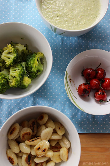 Asamos los ajos en el horno hasta que estén dorados y los trituramos con el brócoli mas blanco, aceite de oliva, sal, pimienta, y añadimos un poco de leche de soja hasta conseguir una textura de salsa.