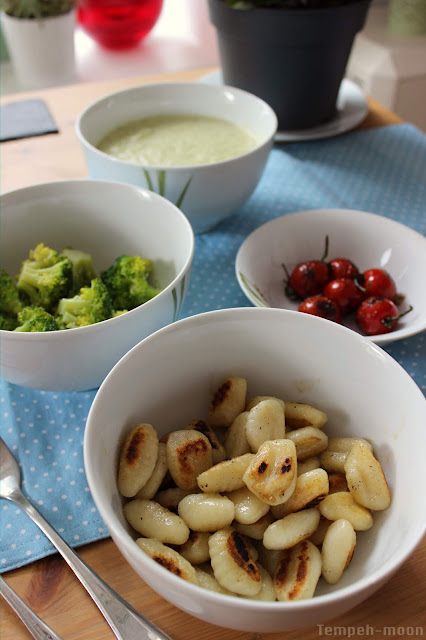 En la misma agua del brócoli hervimos los Gnocchi hasta que empiecen a flotar, y los pasamos rápidamente a la paella donde salteamos los tomates para que se doren un poco.