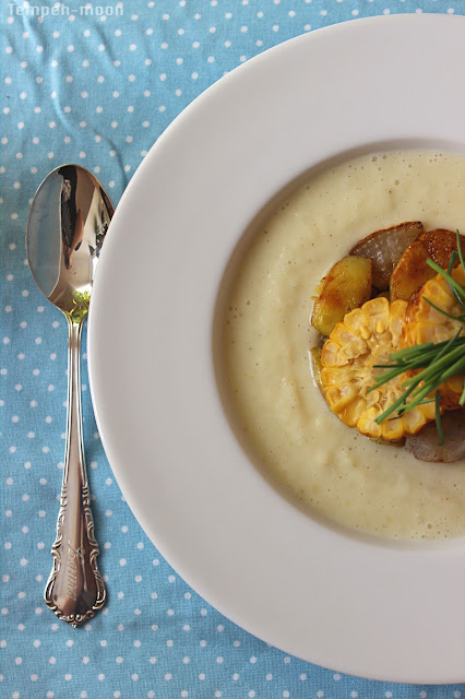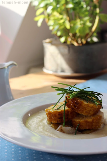 Salteamos la chalota en una olla con un poco de mantequilla de coco, añadimos el resto de Daikon, patatas, los dos ajos sin piel, un poco de leche de soja, vinagre blanco, sal, hierbas aromáticas, un poco de agua, y trituramos bien hasta que nos quede una crema bien fina.