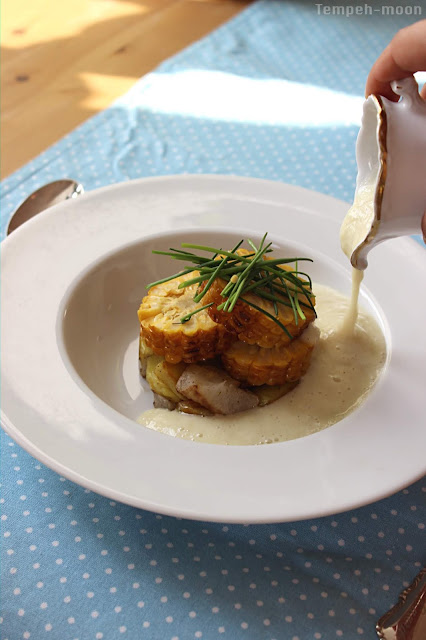 Para emplatar colocamos una anilla en medio del plato y la rellenamos con las verduras, presionando levemente para que queden un poco compactadas, luego unas rodajas de maíz, el cebollino y ya solo nos queda quitar la anilla y añadir la crema.