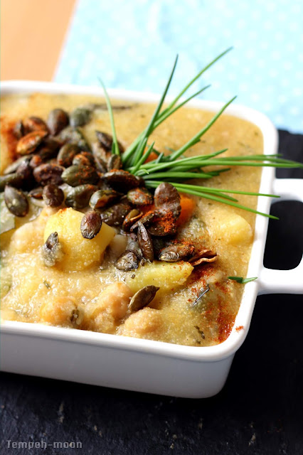 En una paella vamos a dorar las semillas de calabaza sin ningún tipo de grasa, salpimentamos y servimos encima de la sopa con un poco de pimentón dulce y cebollino fresco.