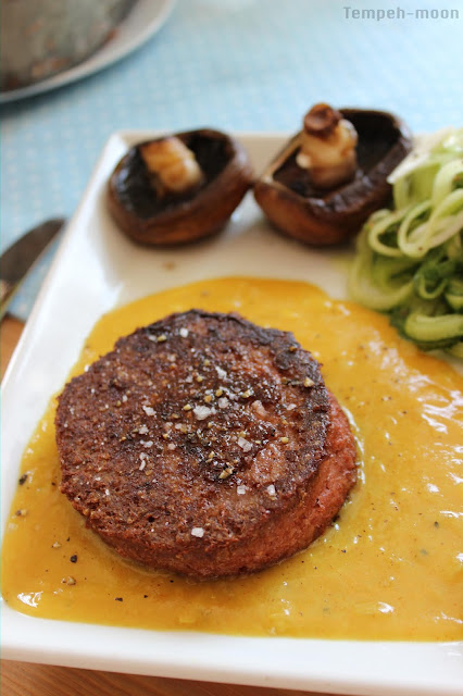 Salteamos la Beyond meat Burger en una paella sin aceite dejando que se dore bien por ambos lados, añadimos un poco de pimienta y sal gorda. En la misma paella salteamos los champiñones enteros con un poco de sal.