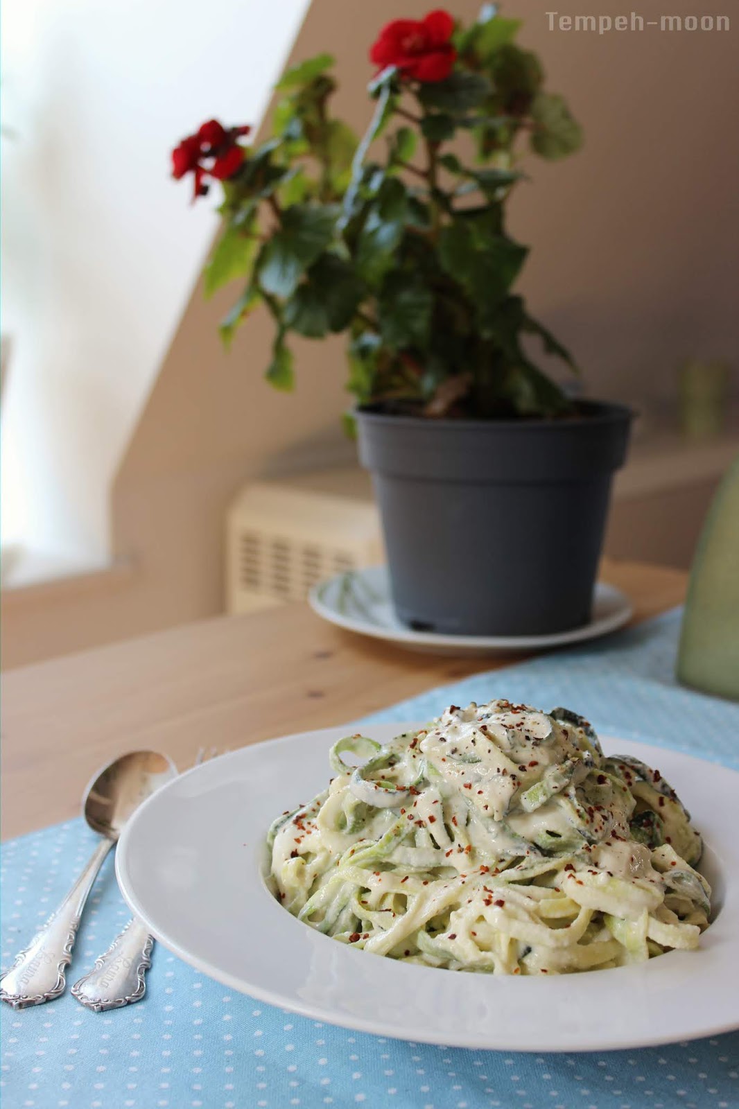 Con un "Espiralizador", cortamos nuestro calabacín en ligeros noodles, mezclamos con la salsa, y servimos con un poco de pimienta negra y chili en polvo.