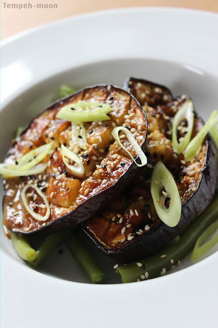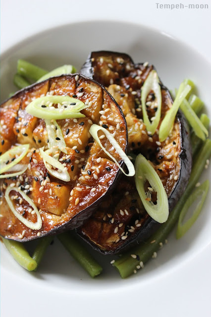 Ponemos un par de rodajas de berenjena por encima con cuidado que no se rompan, con cebolla larga en juliana, sésamo tostado, y listo!.