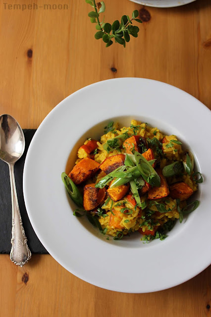 Para emplatar solo tenemos que poner unas cucharadas de arroz en el plato, unos dados de calabaza, las cebollas salteadas, y las verdes reservadas en juliana junto a un poco de perejil picado.