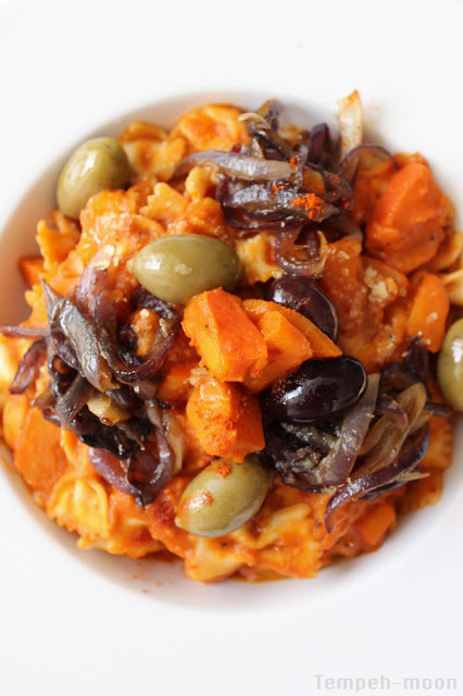 Hervimos la pasta al dente y añadimos a la salsa, podemos emplatar directamente añadiendo luego la cebolla caramelizada o mezclarlo todo directamente. Unas olivas le darán un toque mediterráneo ;)