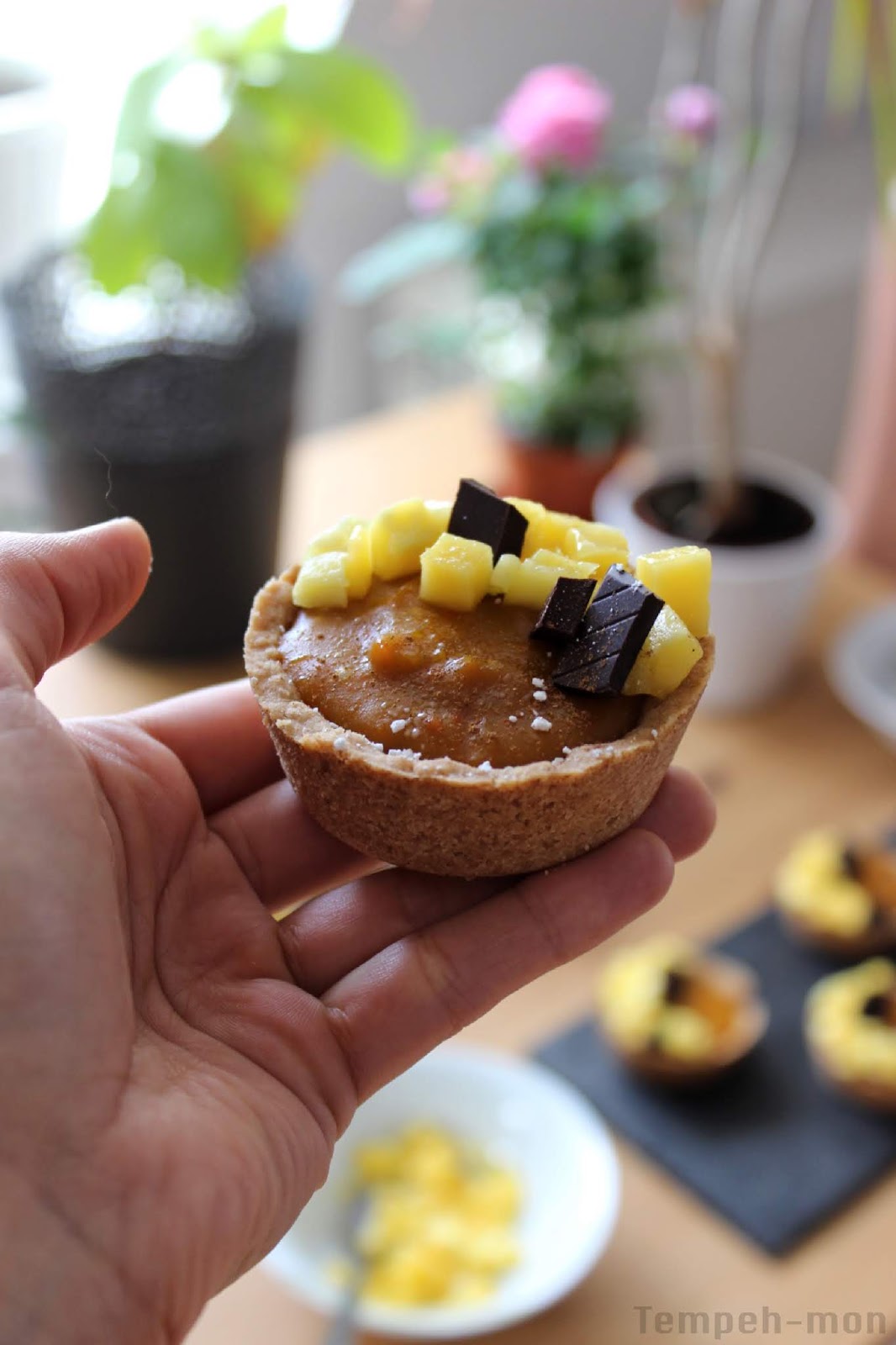 Rellenamos las tartaletas con la crema, colocamos unos dados de mango por encima y unos trocitos de chocolate y canela en polvo.