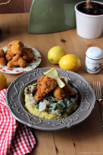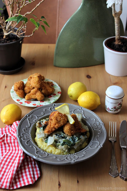 Servimos colocando unas cucharadas de polenta en el plato, luego las acelgas a la crema, y finalmente unas coliflores fritas. Con un poquito de limón la coliflor sabe deliciosa! ;)