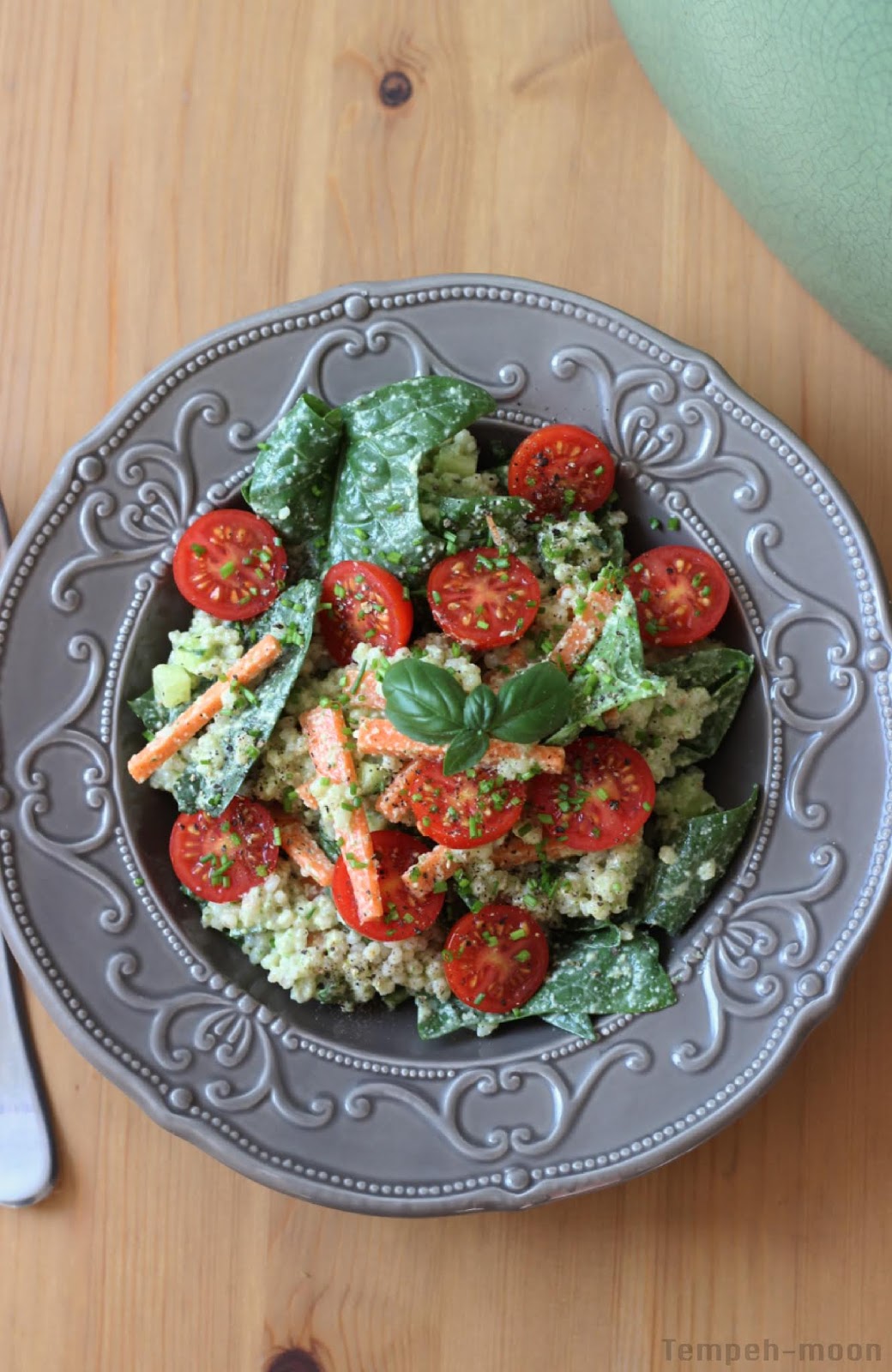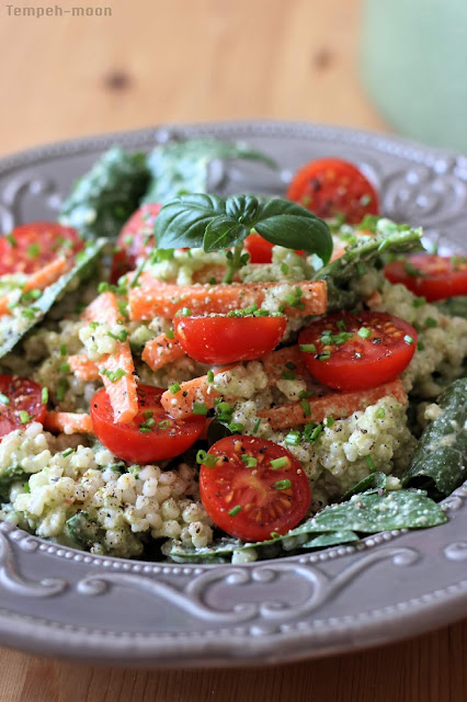 Mezclamos la cebada con las verduras, la salsa y decoramos con los tomates cherry, cebollino picado, y unas hojas de albahaca ;).