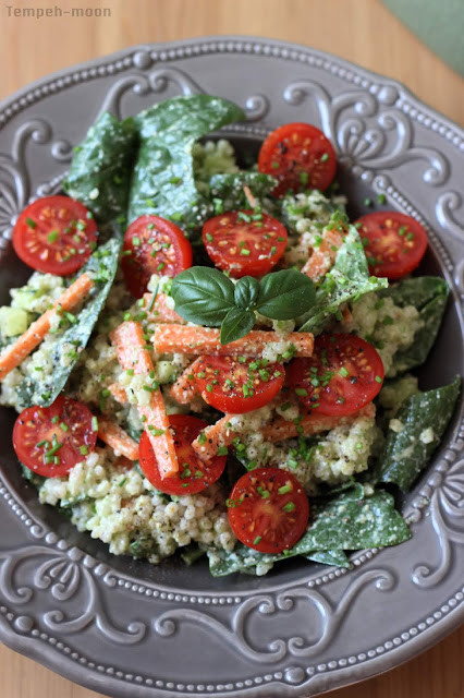 Cortamos las verduras frescas al gusto, yo he hecho daditos del pepino, varitas de la zanahoria, y he dejado las espinacas enteras solamente lavadas.