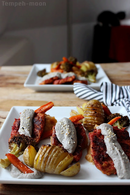 Colocamos todas las verduras y patatas cortadas en una bandeja de horno, con un chorrito de aceite, sal y algunas hierbas aromáticas, y horneamos a 200º hasta que estén doradas.
