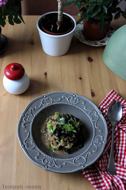Añadimos la levadura de cerveza, el polvo de Cordiceps, la salsa de soja, el aceite de sésamo, el chili en polvo, sal, pimienta y rehogamos bien, añadiendo caldo de verduras poco a poco hasta que el arroz esté al dente y al punto de sal.