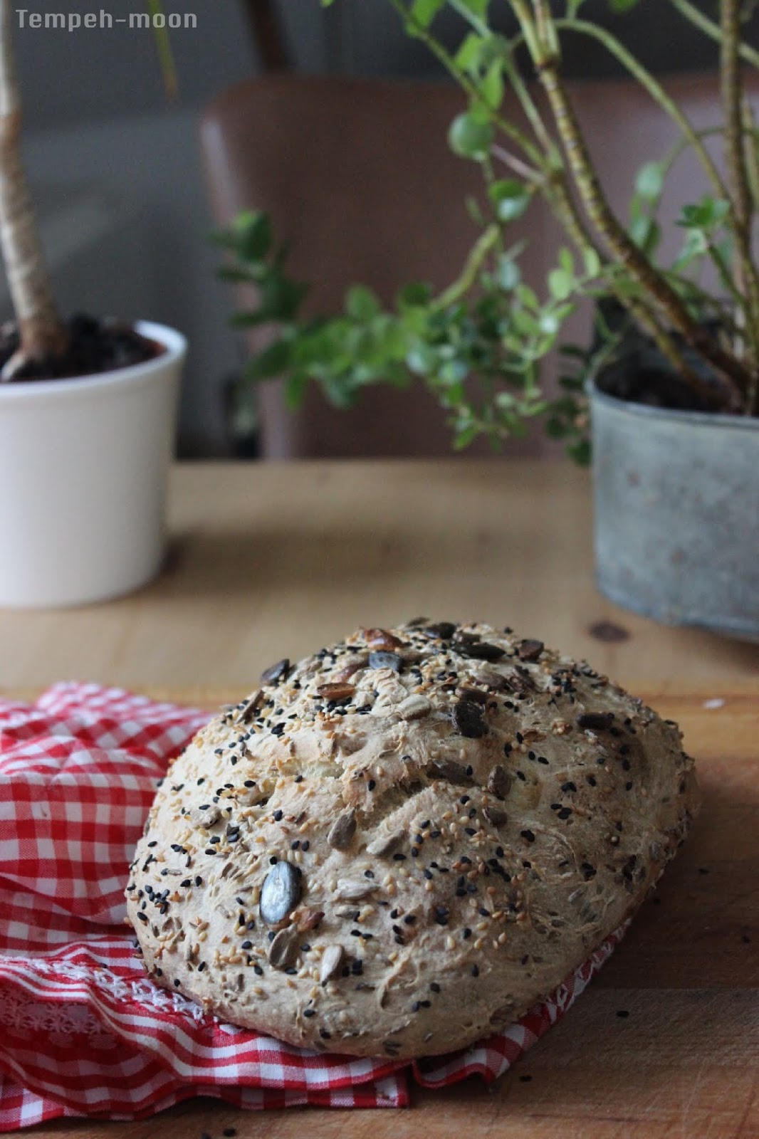 Finalmente colocamos la masa en una fuente para horno, esparcimos unas cuantas semillas por encima, y horneamos 40 min. a 230º hasta que esté dorado por encima.