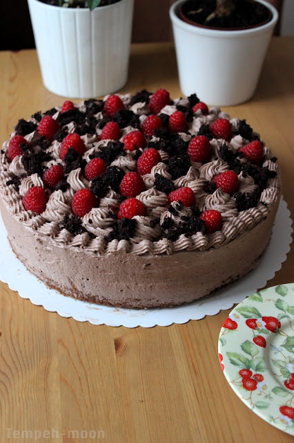 Cortad el pastel horizontalmente por la mitad, repartid bien la crema decorando al gusto, una frambuesas y el pastel desmigajado como último toque.